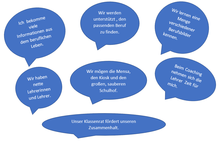 Die Schüler/innen der Berufsfachschule Wirtschaft aus den Schuljahren 19/20 und 20/21 haben auf die Frage: „Was findet ihr gut und was ist euch in diesem Bildungsgang wichtig?“ folgendes geantwortet: